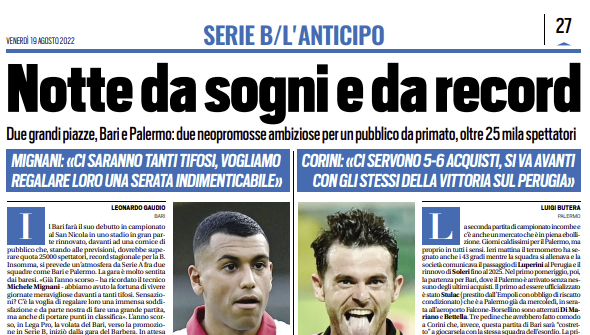 L'edizione odierna di Tuttosport si sofferma su Bari-Palermo e le parole di Mignani. Il Bari farà il suo debutto in...