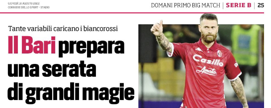 L'edizione odierna de "Il Corriere dello Sport" si sofferma sul l'attesa a Bari in vista della gara di domani contro...
