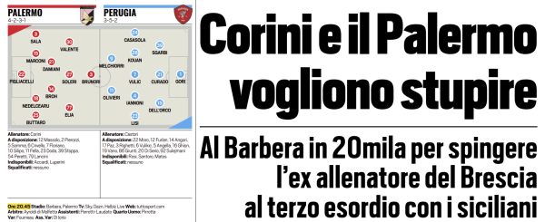 L'edizione odierna di Tuttosport si sofferma sulla gara di stasera tra Palermo e Perugia. Il Corini-day, ma anche il ritorno...