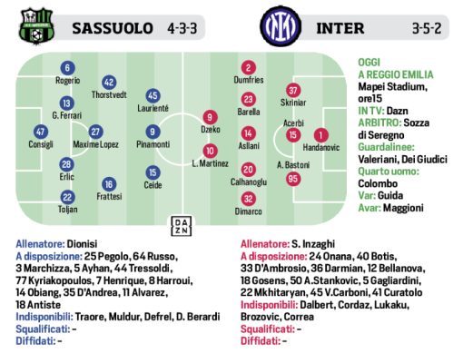 Corriere dello Sport: “Serie A, alle 15 Sassuolo-Inter. Le probabili formazioni”