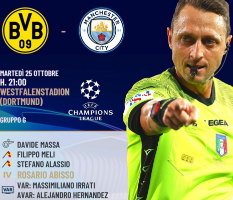 Champions League: l’arbitro palermitano Abisso designato quarto uomo in Borussia Dortmund-Manchester City