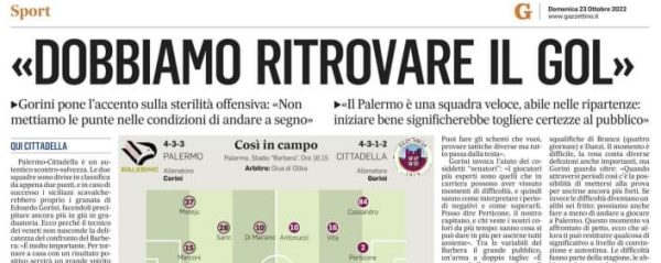 L'edizione odierna de "Il Gazzettino" si sofferma sulle parole di Gorini in vista di Palermo-Cittadella. Palermo-Cittadella è un autontico scontro...