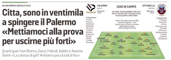 L'edizione odierna de "Il Mattino" riporta le parole di Gorini in vista di Palermo-Cittadella. Branca e Danzi squalificati, Felicioli e,...