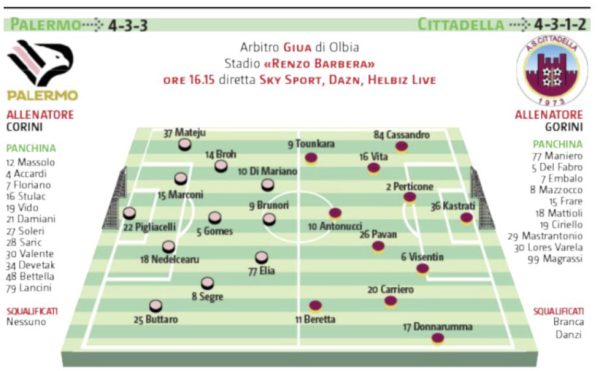 L'edizione odierna de "Il Corriere dello Sport" si sofferma sulle probabili formazioni del match tra Palermo e Cittadella. Allenatore: Corini....