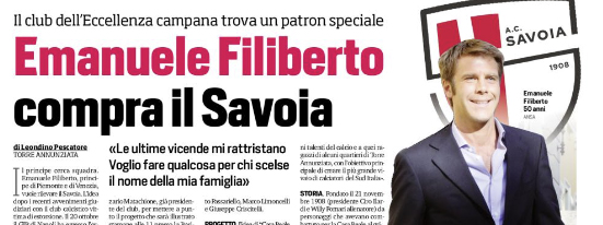L'edizione odierna de "Il Corriere dello Sport" si sofferma su Emanuele Filiberto che rileva il Savoia. Il principe cerca squadra....