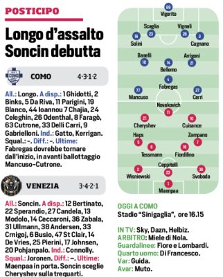 L'edizione odierna de "Il Corriere dello Sport" si sofferma sulle probabili formazioni del match di oggi tra Como e Venezia.