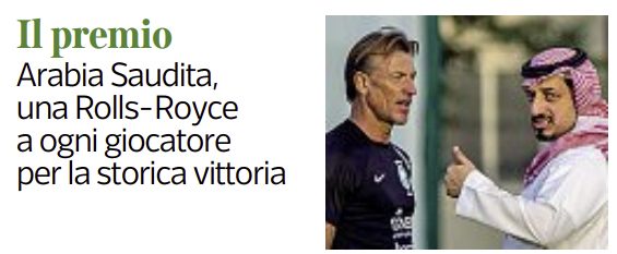 L'edizione odierna de "Il Corriere della Sera" si sofferma sulla vittoria dell'Arabia Saudita sull'Argentina che è stata premiata dal principe...