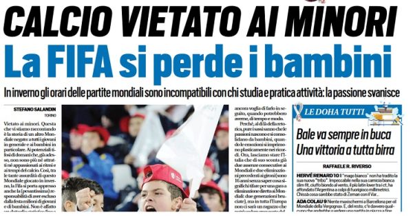 L'edizione odierna di Tuttosport si sofferma sul Mondiale in Qatar ad orario inconciliabili per i minori. Vietato ai minori. Questa...