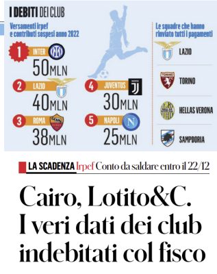 L'edizione odierna de "Il Fatto Quotidiano" si sofferma sulla Serie A e i debiti dei club. Campioni di debiti, i...