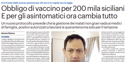 L'edizione odierna de "Il Giornale di Sicilia" si sofferma sull'obbligo vaccinale per oltre 200mila siciliani. I siciliani obbligati a vaccinarsi...