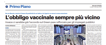 L'edizione odierna de "Il Giornale di Sicilia" si sofferma sull'obbligo vaccinale che ormai sembra essere imminente. Un’impennata del tasso di...