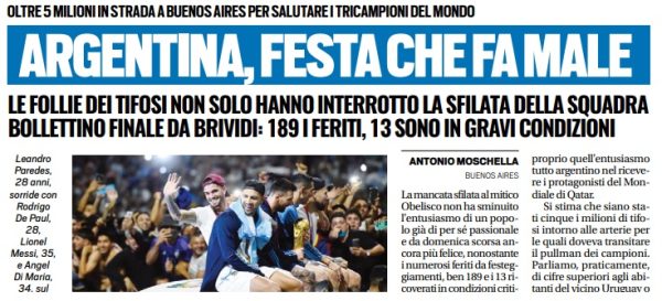 Tuttosport: “Argentina, festa che fa male. Il bollettino finale è da brividi: 189 i feriti, 13 in gravi condizioni”