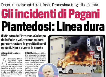 L'edizione odierna de "Il Corriere dello Sport" si sofferma sugli incidenti di Pagani. Adesso basta: il limite raggiunto il 10...
