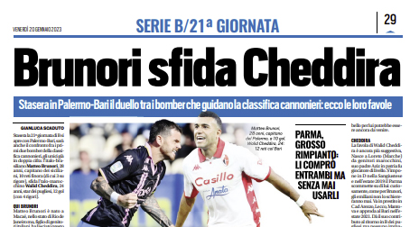 L'edizione odierna di Tuttosport si sofferma sulla sfida Brunori-Cheddira in programma questa sera al Renzo Barbera. Stasera la 21ª giornata...