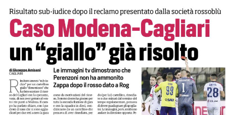 L'edizione odierna de "Il Corriere dello Sport" si sofferma sul giallo in Modena-Cagliari. Risultato ancora “sub-iudice” per un cartellino giallo...