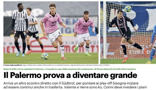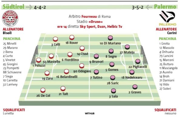 L'edizione odierna de "Il Giornale di Sicilia" si sofferma sulle probabili formazioni del match tra Sudtirol e Palermo.
