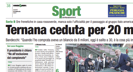 L'edizione odierna de "Il Corriere dell'Umbria" si sofferma sulle trattative per la cessione della Ternana. Vendita della Ternana, si entra...