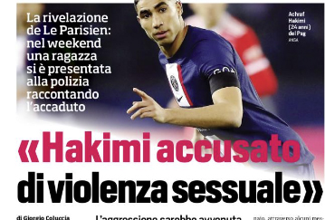 L'edizione odierna de "Il Corriere dello Sport" si sofferma sullo scandalo Hakimi, accusato di violenza sessuale. Ieri sera a Parigi...
