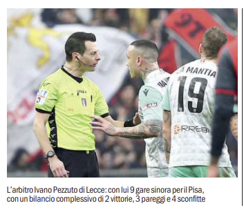 L'edizione odierna de "Il Tirreno" si sofferma sui precedenti tra l'arbitro Pezzuto e Pisa-Palermo. Ivano Pezzuto di Lecce arbitrerà il...