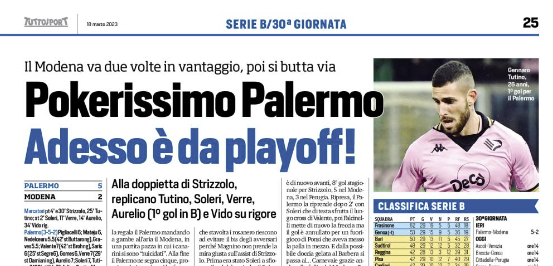 L'edizione odierna di Tuttosport si sofferma sulla cinquina rifilata dal Palermo al Modena. Una notte in zona playoff. Se la...