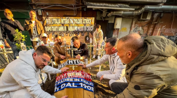 La città di Napoli si prepara a festeggiare lo scudetto. Alcuni sostenitori azzurri hanno usato una bara con alcune sciarpe...