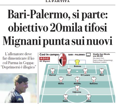 L'edizione odierna de "Il Giornale di Sicilia" si sofferma sulle probabili formazioni del match di serie B tra Bari e...