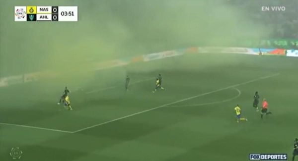 La coltre di fumo delle torce accese dai tifosi di casa ha invaso il campo. La nube era talmente fitta...