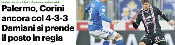 L'edizione odierna de "Il Giornale di Sicilia" si sofferma sulle scelte di modulo di Corini in vista del Bari. Corini...