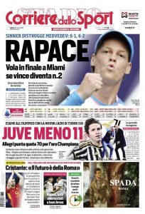 L'edizione odierna de "Il Corriere dello Sport" dedica la prima pagina a Sinner.