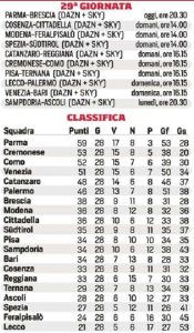 Serie B, comincia la 29a giornata. Il programma e la classifica aggiornata