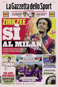 L'edizione odierna de "La Gazzetta dello Sport" dedica la prima pagina al Milan e a Zirkzee.