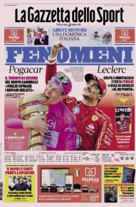 L'edizione odierna de "La Gazzetta dello Sport" dedica la prima pagina ai vincitori del Giro d'Italia e Formula 1.