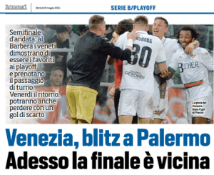 L'edizione odierna di Tuttosport si sofferma sulla vittoria del Venezia sul campo del Palermo. Un piede e mezzo in finale....