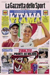 L'edizione odierna de "La Gazzetta dello Sport" dedica la prima pagina alle due stelle italiane del tennis, Sinner e Paolini.