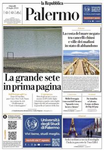 L'edizione odierna de "La Repubblica Palermo" dedica un titolo in prima pagina alla siccità che attanaglia la Sicilia.