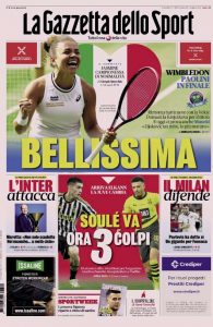 L'edizione odierna de La Gazzetta dello Sport dedica un titolo in prima pagina alla vittoria di Jasmine Paolini.