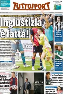 L'edizione odierna di Tuttosport dedica un titolo in prima pagina alla squalifica di Conceicao e alla Juventus.