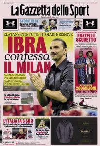 L'edizione odierna de La Gazzetta dello Sport dedica un titolo in prima pagina a Ibra e al Milan.