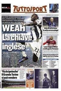 L'edizione odierna di Tuttosport dedica un titolo in prima pagina alla Juventus e a Weah.