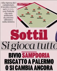 L'edizione odierna de "La Gazzetta dello Sport" si sofferma su Sottil che contro il Palermo si gioca tutto. La Sampdoria...