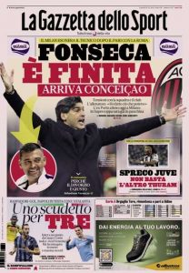 L'edizione odierna de La Gazzetta dello Sport dedica un titolo in prima pagina al Milan e a Fonseca.