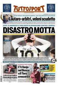 L'edizione odierna di Tuttosport dedica un titolo in prima pagina alla Juventus eliminata dalla Coppa Italia.