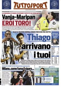 Prima pagina Tuttosport: “Thiago arrivano i tuoi”