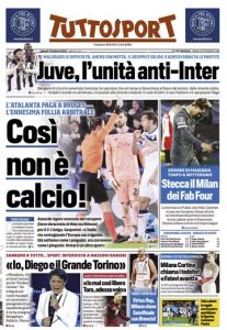 L'edizione odierna di Tuttosport dedica un titolo in prima pagina alla gara dell'Atalanta e l'ennesima follia arbitrale.