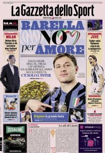 L'edizione odierna de La Gazzetta dello Sport dedica un titolo in prima pagina a Barella.