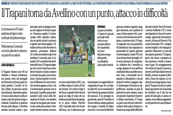 “Il Trapani ottiene uno 0-0 ad Avellino e rimane imbattuto, ma questa volta dal pareggio del Partenio arrivano pochi segnali positivi. L’undici di Cosmi, infatti, ha peccato ancora di continuità, riuscendo a giocare il suo calcio soltanto nella seconda metà del primo tempo e cedendo l’iniziativa ai padroni di casa nelle ripresa. L’Avellino sembra trovarsi subito a proprio agio sotto la pioggia intensa che colpisce il terreno di gioco. Funziona meglio il centrocampo della squadra irpina, che nei primi minuti contrasta e riparte con ottimo piglio. L’Avellino arriva al tiro due volte in maniera pericolosa: Bellone (5’) calcia un sinistro a giro che lambisce il secondo palo e Castaldo (14’) conclude alto dal limite dell’area. Il Trapani impiega circa venti minuti per prendere le misure e inizia a tessere la tela del suo gioco con convinzione. Il primo squillo è un sinistro di Nizzetto da venti metri, che termina appena a lato, e da lì la formazione granata non si ferma più. Il pallino passa decisamente nelle mani della formazione di Cosmi, che sembra trovare la via giusta per mettere alle corde gli avversari. Coronado è svelto e deciso a trovare un varco sulla destra (34’), ma la difesa irpina si salva all’ultimo istante. Un minuto dopo è De Cenco a spedire fuori da due passi un colpo di testa che sarebbe stato più facile da spingere in porta. Infine, Ferretti (40’) conclude bene dal limite dall’area, ma è sfortunato per la deviazione in angolo della retroguardia di casa. Si va al riposo sullo 0-0, ma la sensazione è che l’inerzia sia passata dal lato dei granata. È un presagio ingannevole, perché l’Avellino al rientro diventa subito padrone del campo. L’esordio di Figliomeni fra i tre centrali difensivi granata sembra regalare maggior sicurezza, ma i padroni di casa si fanno presto vivi, ancora con un tiro da fuori area di Paghera, terminato alto. Il Trapani risponde con una punizione di Colombatto (da segnalare la personalità di questo giovane centrocampista, classe ’97) calciata di poco fuori bersaglio. Alla terza giornata di campionato, chiedere che i ventidue in campo godano di una perfetta condizione fisica sarebbe eccessivo. Così, è inevitabile che le squadre si allunghino e che gli attacchi trovino maggiori spazi. Ardemagni e Gavazzi ne approfittano, creando un paio di pericoli da sotto misura, senza che peraltro il portiere Guerrieri debba intervenire. Il Trapani, però, non ritrova la determinazione della prima frazione e Cosmi si accorge delle difficoltà dei suoi uomini: fuori De Cenco e dentro Raffaello (72’): viene così ispessita la linea di centrocampo, spostando Coronado in avanti, al fianco di Ferretti. È lo stesso Coronado (75’), sempre uno dei migliori, che impegna il portiere Radunovic in uno dei rari spunti granata. Il Trapani, però, non riesce a proporre la sua manovra e tende a conservare il pari. Un atteggiamento che rischia di punire i granata, sorretti nel finale dalla verve di Barillà, entrato al posto di Nizzetto. Come da copione, al termine di una lunga apnea, è proprio il Trapani ad avere la palla buona per portar via il successo da Avellino: ma il tiro da tre punti di Coronado, in pieno recupero, trova efficace opposizione del portiere di casa Radunovic”. Questo quanto si legge su “La Repubblica”.
