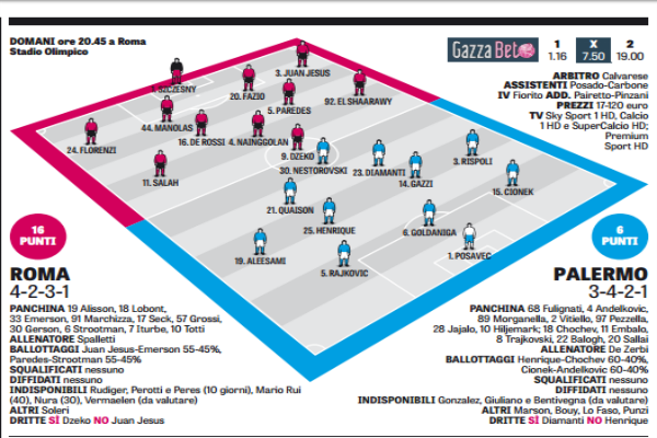 Domenica sera alle 20.45 scenderanno in campo Roma e Palermo, sfida valida per la 9^ giornata del campionato di serie...