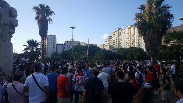 Iniziano a radunarsi i tifosi del Palermo in occasione della manifestazione organizzata a Piazza Alcide De Gasperi contro la dirigenza...