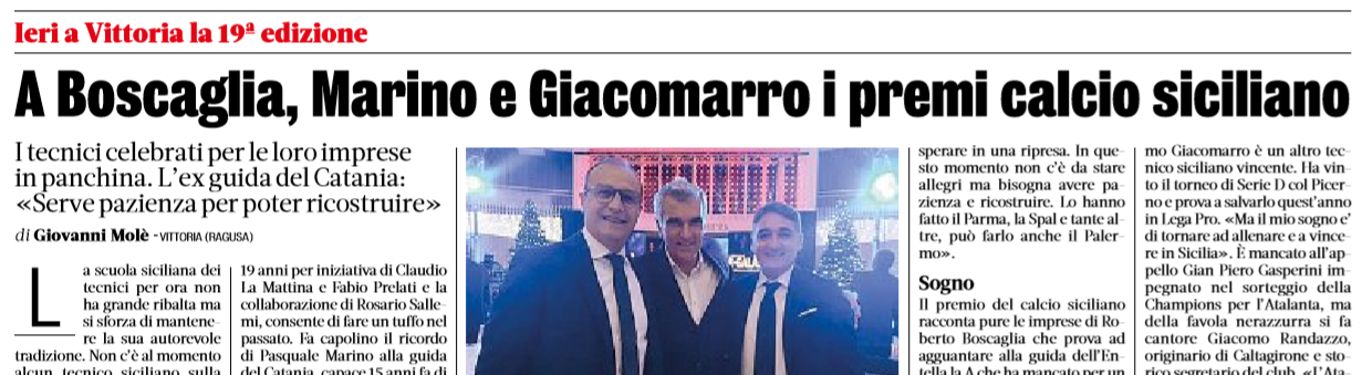 L’edizione odierna della “Gazzetta dello Sport” riporta le dichiarazioni di Marino, Boscaglia e Giacomarro, che hanno ricevuto i premi del calcio siciliano nazionale. Marino spera: «Io non mi arrendo e spero di tornare presto in panchina – chiosa il tecnico— . Purtroppo è un momentaccio per il calcio siciliano, bisogna sperare in una ripresa. In questo momento non c’è da stare allegri ma bisogna avere pazienza e ricostruire. Lo hanno fatto il Parma, la Spal e tante altre, può farlo anche il Palermo». Boscaglia racconta le sue imprese: «Lo scorso anno ho vinto il campionato e ora siamo in zona playoff. La Serie A è un sogno, chissà che questo non sia l’anno buono. Abbiamo i mezzi tecnici per centrare il risultato».Mimmo Giacomarro è un altro tecnico siciliano vincente. Ha vinto il torneo di Serie D col Picerno e prova a salvarlo quest’anno in Lega Pro.«Ma il mio sogno è di tornare ad allenare e a vincere in Sicilia». È mancato all’appello Gian Piero Gasperini impegnato nel sorteggio della Champions per l’Atalanta, ma della favola nerazzurra si fa cantore Giacomo Randazzo, originario di Caltagirone e storico segretario del club. «L’Atalanta è un esempio da seguire. Il calcio siciliano dovrebbe trarne esempio».