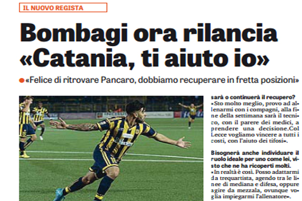 “Il giustiziere del Catania adesso è… rossazzurro. Francesco Bombagi chiede quasi scusa per quel gol che, da avversario, segnò ai rossazzurri durante il finale incandescente di Castellammare di Stabia nel girone d’andata: «Ero tesserato con la Juve Stabia, ero entrato da qualche minuto, al 94’ firmai il 2-1 finale. Mi… spiace, magari – scherza – se avessi previsto il passaggio in Sicilia non lo avrei fatto». Scherzi a parte perchè ha accettato questo trasferimento? «Perchè Catania è sempre un’occasione importante, una piazza che non si può certo rifiutare. Quando è decollata la trattativa ho dato la mia immediata disponibilità al club etneo». Adesso si prepara la partita del riscatto contro il Lecce. Ma lei ci sarà o continuerà il recupero? «Sto molto meglio, provo ad allenarmi con i compagni, alla fine della settimana sarà il tecnico, con il parere dei medici, a prendere una decisione.Col Lecce vogliamo vincere a tutti i costi, con l’aiuto dei tifosi». Bisognerà anche individuare il ruolo ideale per uno come lei, visto che ne ha ricoperti molti. «In realtà è così. Posso adattarmi da trequartista, agendo tra le linee di mediana e difesa, oppure agire da mezzala, ovunque voglia impiegarmi l’allenatore». Che lei conosce bene, visto che Pancaro l’ha guidata l’anno passato proprio nella Juve Stabia. «Spero di poter dare una mano a lui e al gruppo, arrivo qui con una grande voglia di giocare e di ritrovare un tecnico con cui sono stato bene. Non l’ho sentito durante la stagione, ma quando mi sono infortunato, un suo messaggio di incoraggiamento mi ha davvero fatto sentire importante a livello umano. Certi rapporti non finiscono». Ha ricominciato con Pancaro. «Sono contento, non ci resta che lavorare per recuperare il tempo perso e i punti che meritiamo»”. Questo è quanto si legge sull’edizione odierna de “La Gazzetta dello Sport”.
